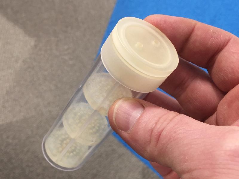 The prints were completed on the MultiJet, and the hole sizes were made to be large enough such that wax removal was possible. Smaller sizes had been attempted and the wax was unremovable.